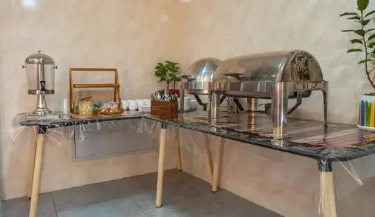سالن صبحانه خوری اقامتگاه سنتی سیمرغ شیراز از ساعت 7:30 تا 9 صبح امکان صرف صبحانه برای 20 نفر را فراهم کرده است.